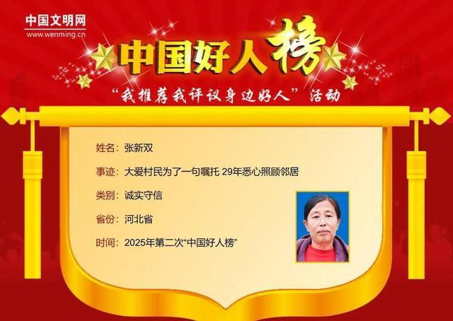 张新双,女,1969年8月生,河北省沧州市盐山县边务镇前胡同村村民。自嫁入前胡同村后,她与婆婆共同照顾残疾邻居张景华一家。婆婆年迈后,她牢记婆婆的临终嘱咐,独自接过照顾重担,悉心照料其饮食起居、生病护理,用行动诠释了诚信与大爱。(记者高珊)