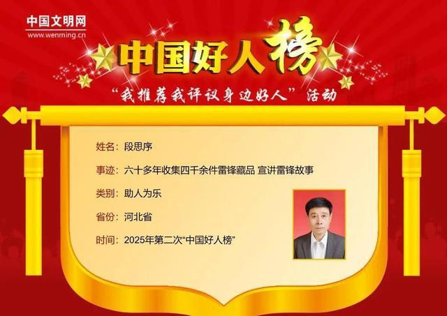 段思序,男,1953年3月生,中共党员,河北省唐山市开滦赵各庄矿业公司培训中心退休教师,唐山雷锋精神纪念馆馆长。他收集雷锋相关物品达4000余件,自费举办“雷锋事迹巡回展”600余场次,创办河北省首个雷锋精神纪念馆、雷锋主题邮局,讲解接待访客约十万余人次。多年来,段思序分别以“感恩的唐山人”和“雷锋”的名义捐款20余万元。段思序曾荣获“河北省道德模范'提名奖等荣誉。