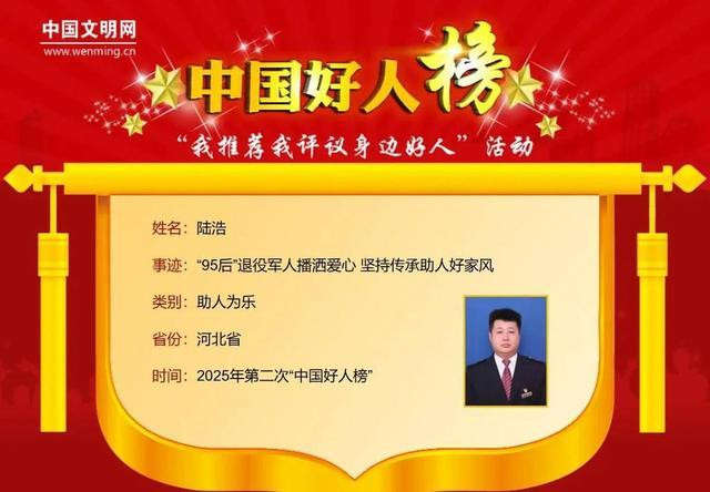 陆浩,男,1995年8月生,中共党员,中国铁路北京局保定工务段职工。从小深受良好家风家教影响的陆浩,常年资助困难儿童和家庭。退役后,他组建爱心志愿服务队,开展无偿献血、科普和公益服务,累计献血小板32次,推动无偿献血知识普及。他积极参与救助困难群众,化解矛盾冲突,被誉为“热心肠的活雷锋”。陆浩曾荣获“河北好人”等荣誉。